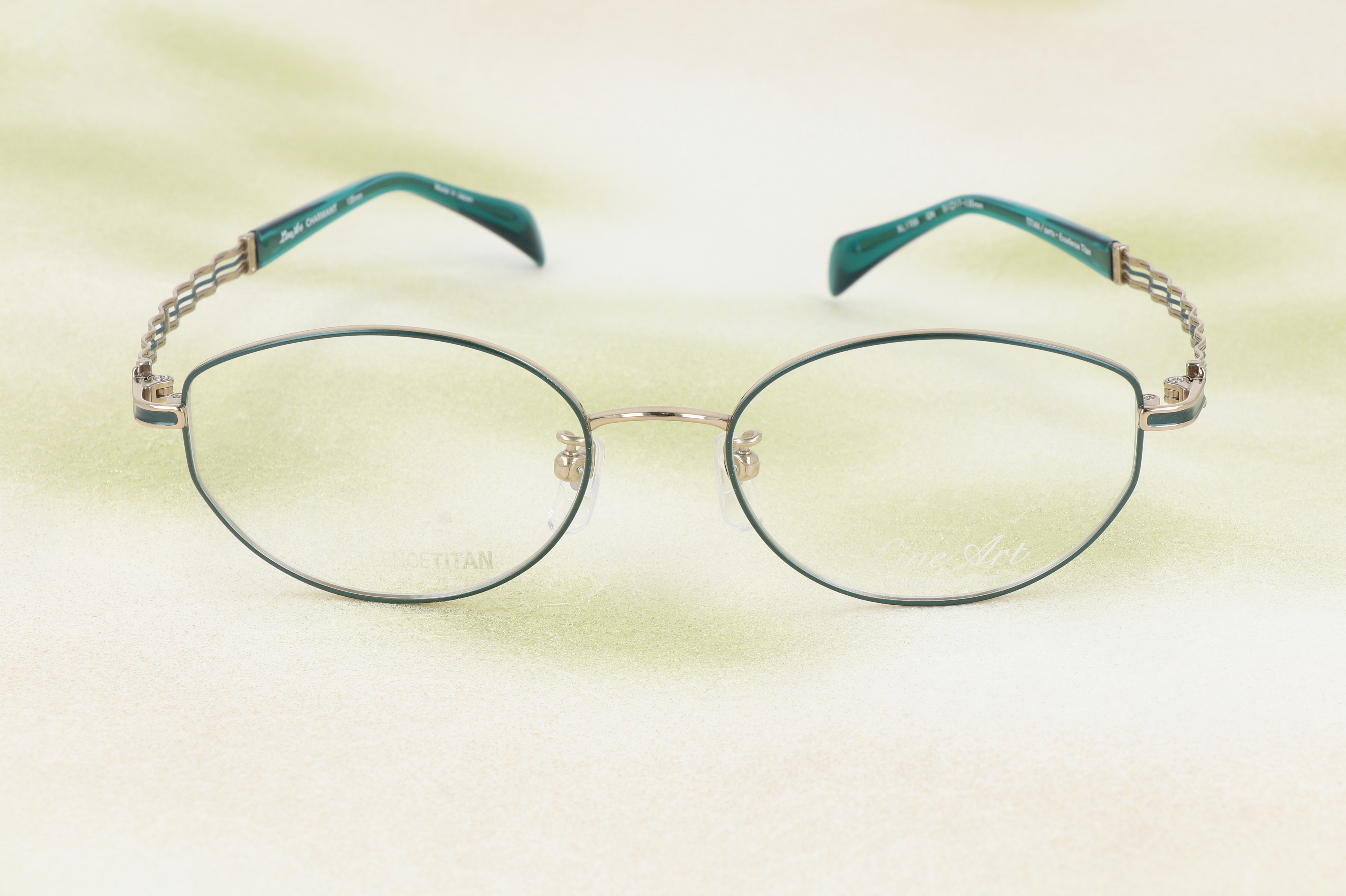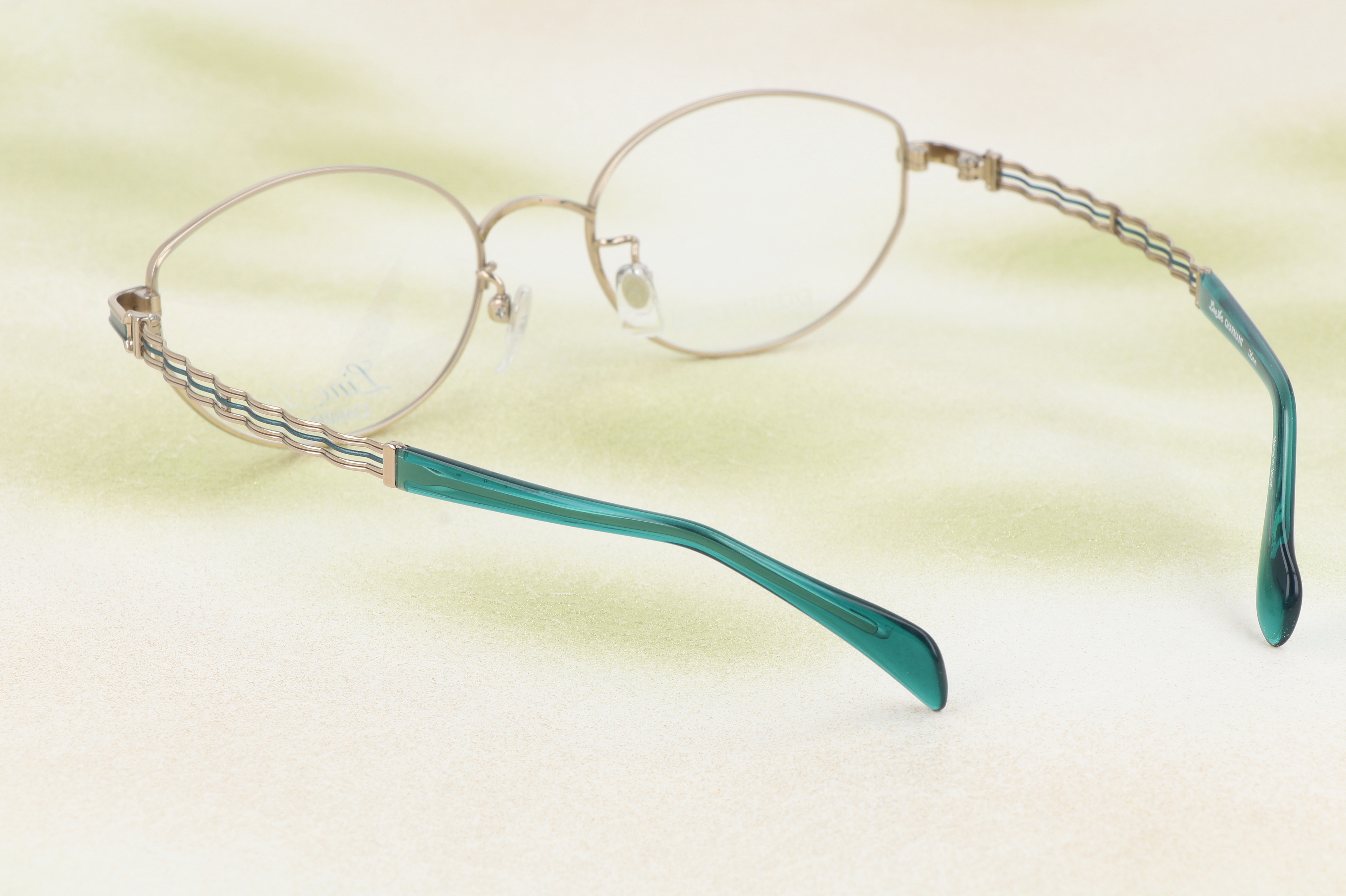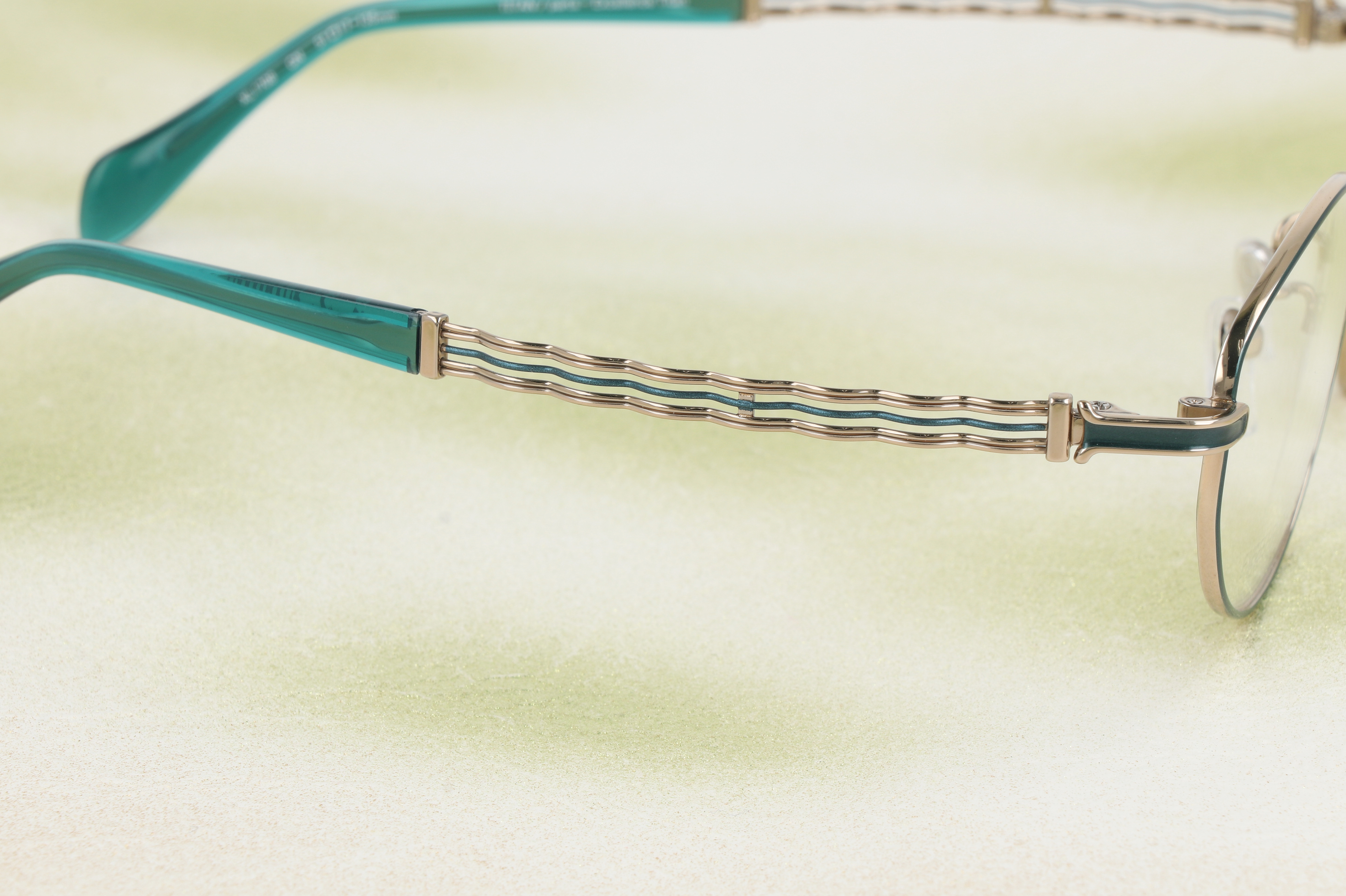 テンプルエンドにあしらわれたグリーンの差し色は、控えめでありながら個性を光らせるディテール。